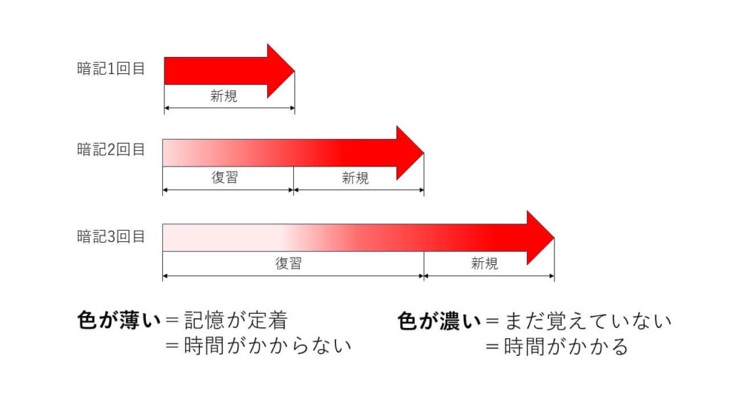 赤く濃いほど新しく、覚えるのに時間がかかり、何度も復習するうちに記憶が定着し、時間がかからなく(色が薄く)なっていきます。